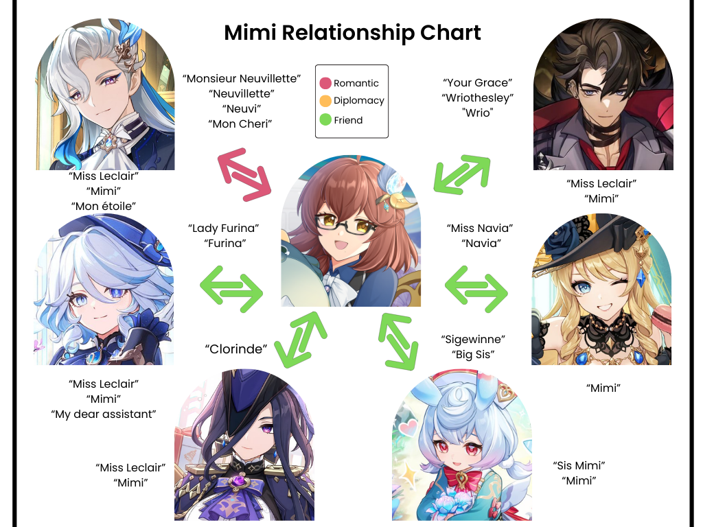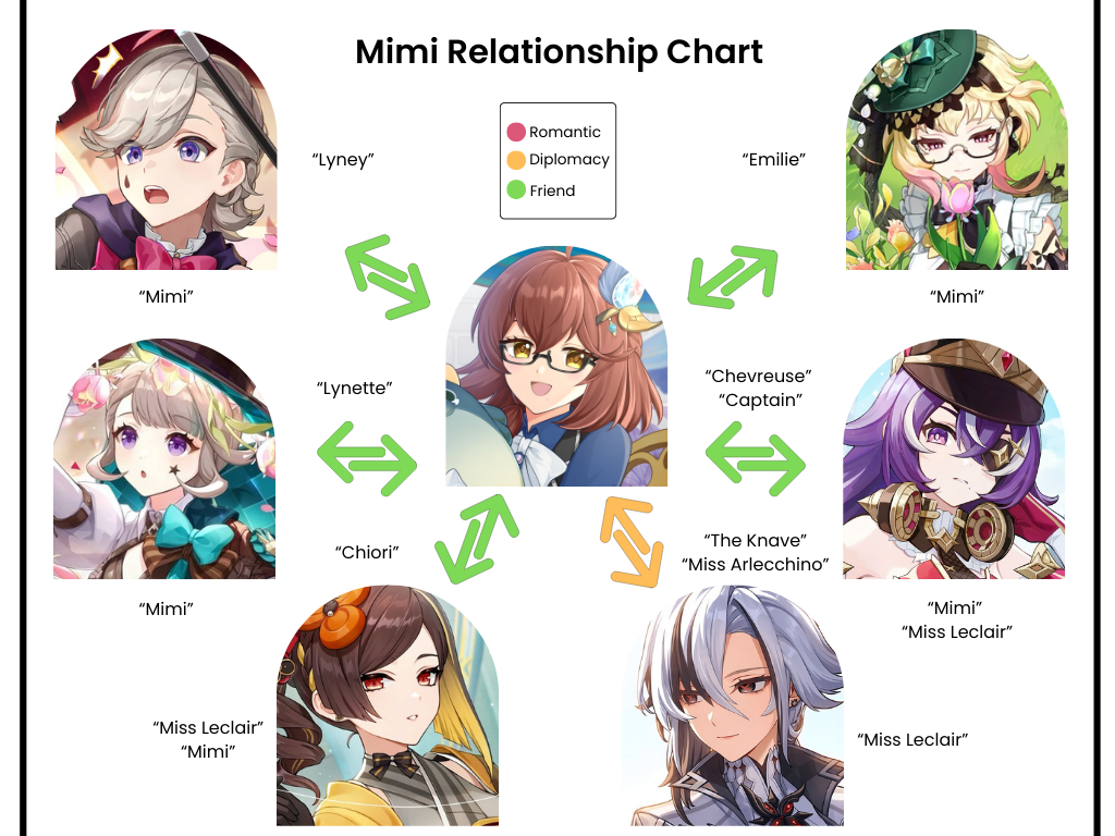 Now grown, Mimi still lives in her grandmother’s home, preserving it with care and love. Though her past is scarred by pain, she has chosen a different path, kindness. Supporting Neuvillette is not only duty, but a vow to protect someone she treasures, and to ensure that no one under her care ever feels the same loneliness she once knew.